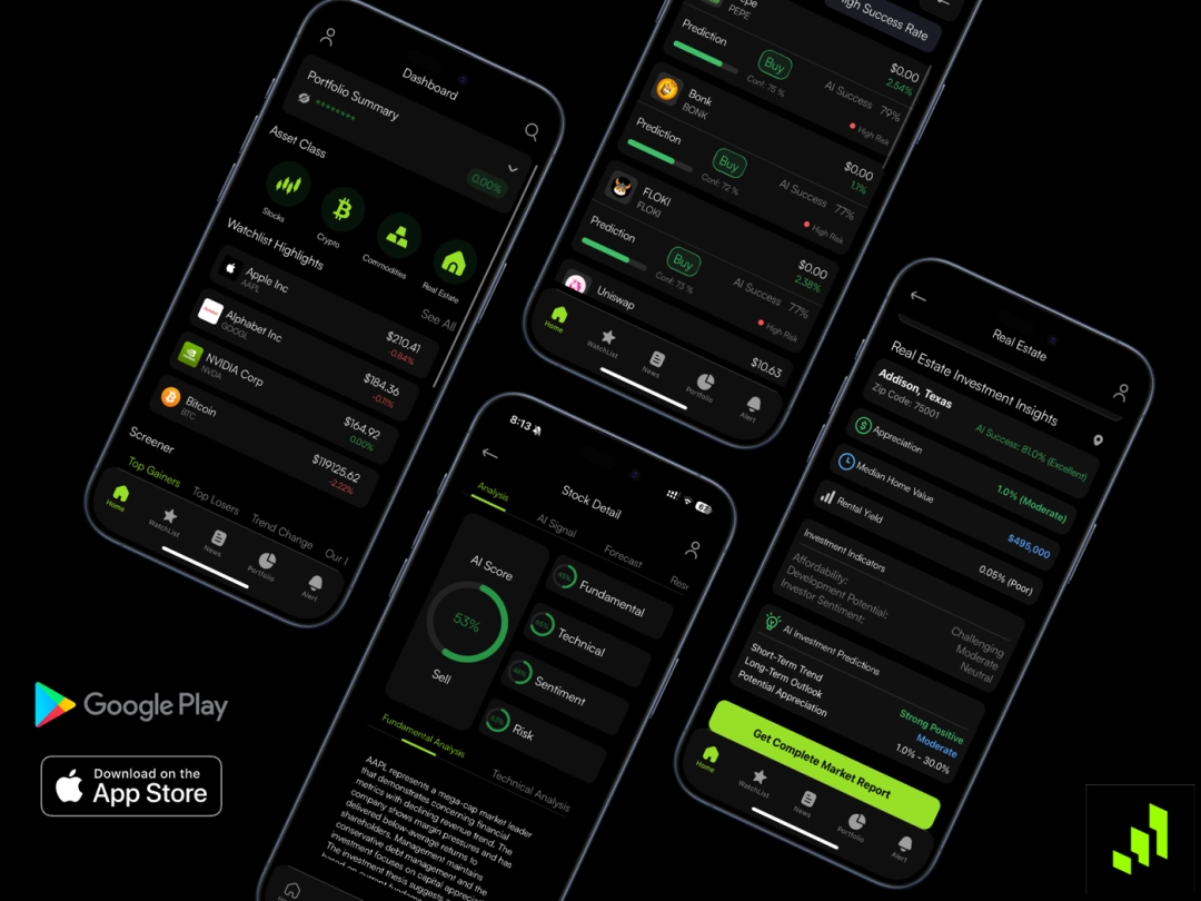 – AI Market Predictions: Machine learning models deliver market trend predictions across stocks, commodities, crypto, and real estate.