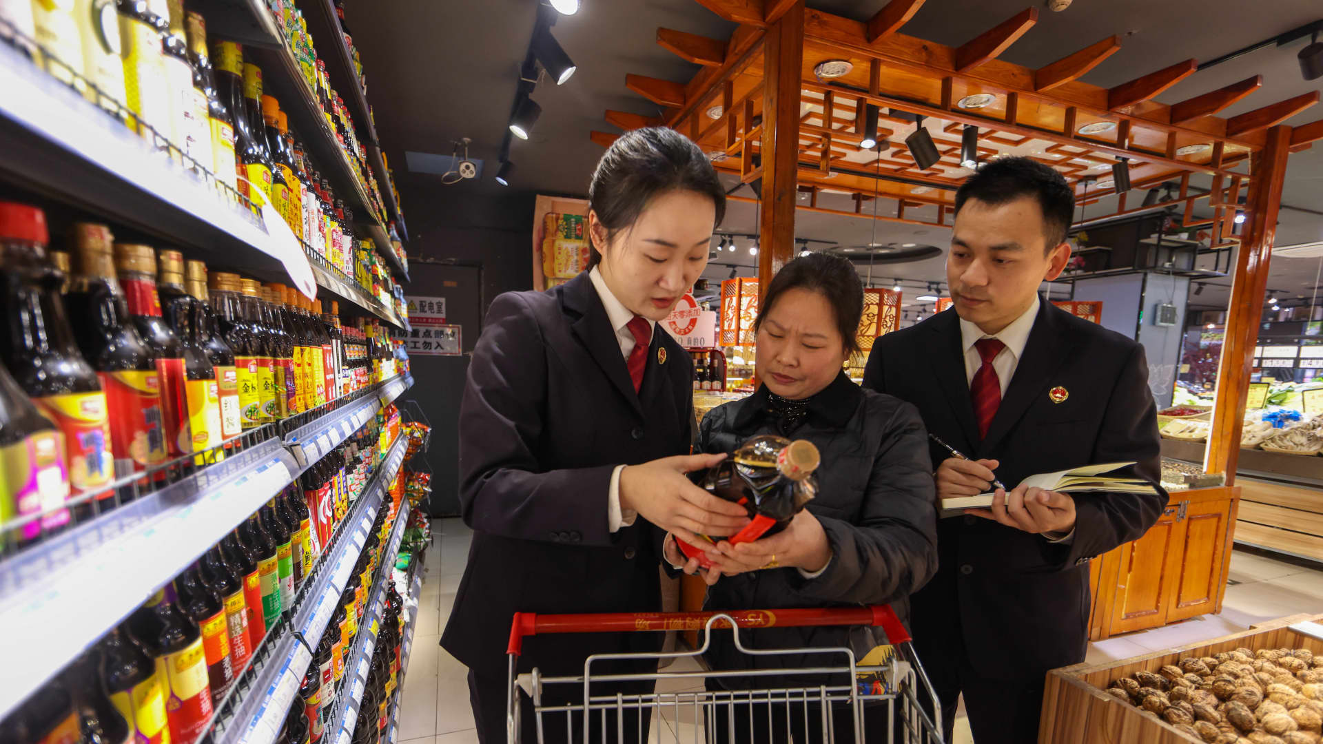 TONGREN, CHINA – MARCH 13, 2025 – Prosecutors explain to consumers how to buy qualified products at a supermarket in Pingxi street of Yuping Dong Autonomous County in Tongren, southwest China’s Guizhou province on March 13, 2025.