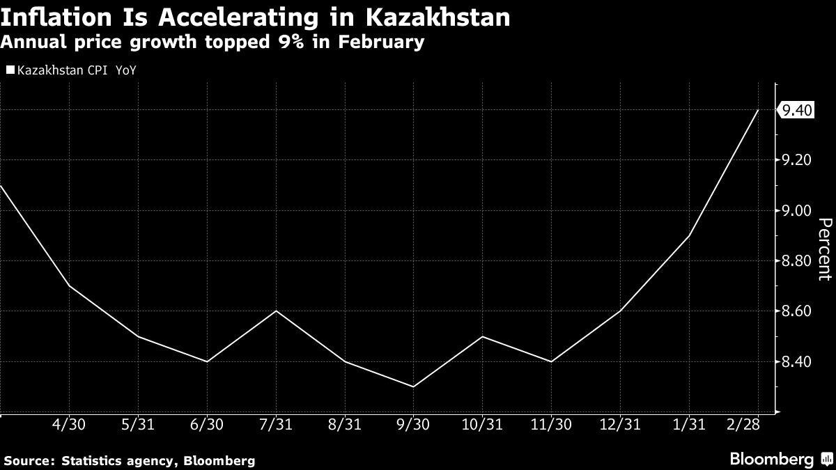 Consumer-price growth quickened for a third month to reach 9.4% in February from a year earlier, far outstripping the central bank’s 5% target. The government highlighted a “negative” trend in inflation this week, forecasting that it would reach about 10% by the end of the year, according to the Kazinform news service.