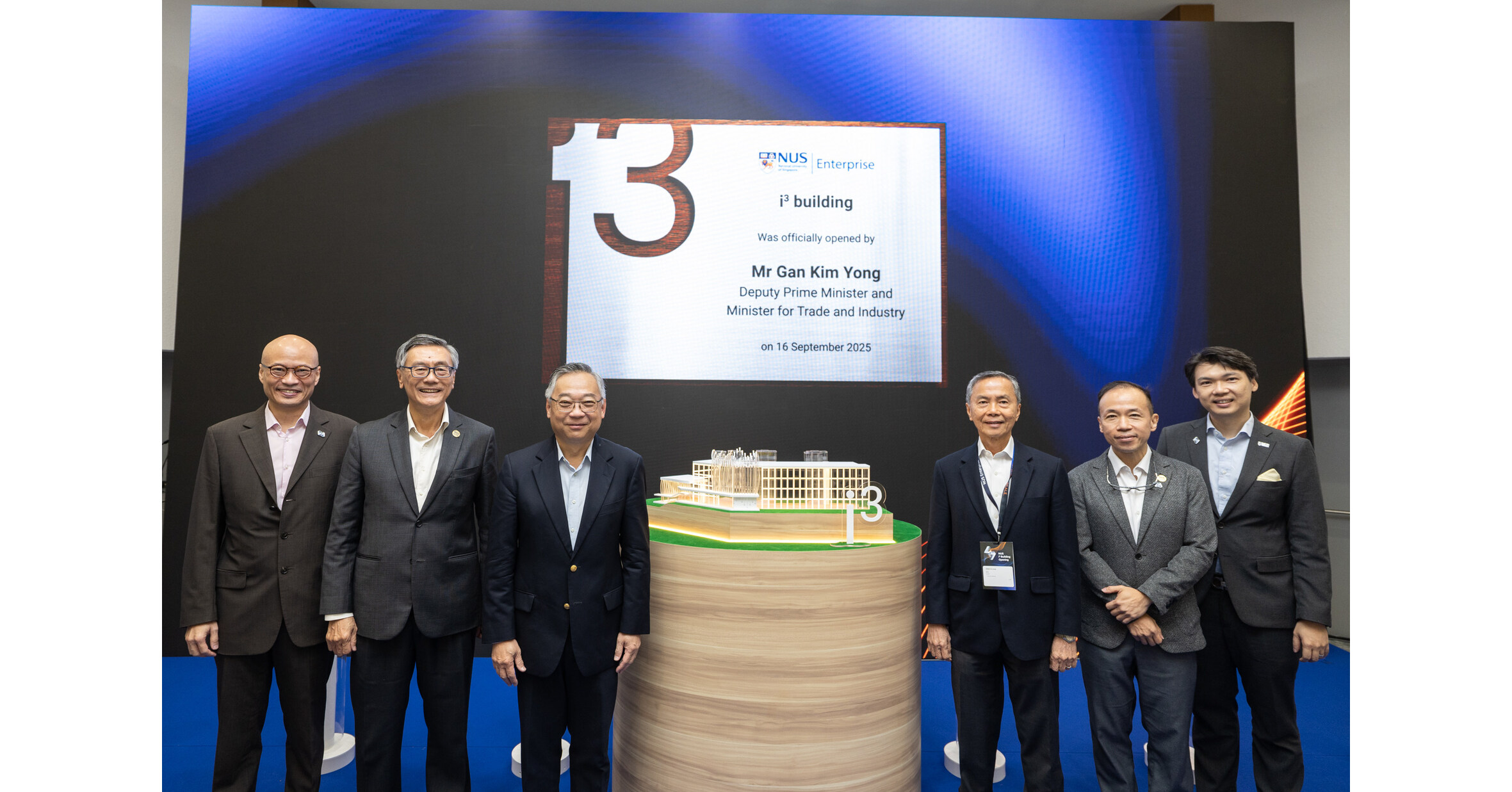 (From left) Dr Tan Sian Wee, NUS Senior Vice President (Innovation and Enterprise); Professor Tan Eng Chye, NUS President; Mr Gan Kim Yong, Deputy Prime Minister and Minister for Trade and Industry; Mr Hsieh Fu Hua, Chairman of the NUS Board of Trustees; Professor Aaron Thean, NUS Deputy President (Academic Affairs) and Provost; and Associate Professor Benjamin Tee, Vice President (Innovation and Enterprise), NUS Enterprise, launched the NUS i3 building, a launchpad for innovation and impact, on 16 September 2025.