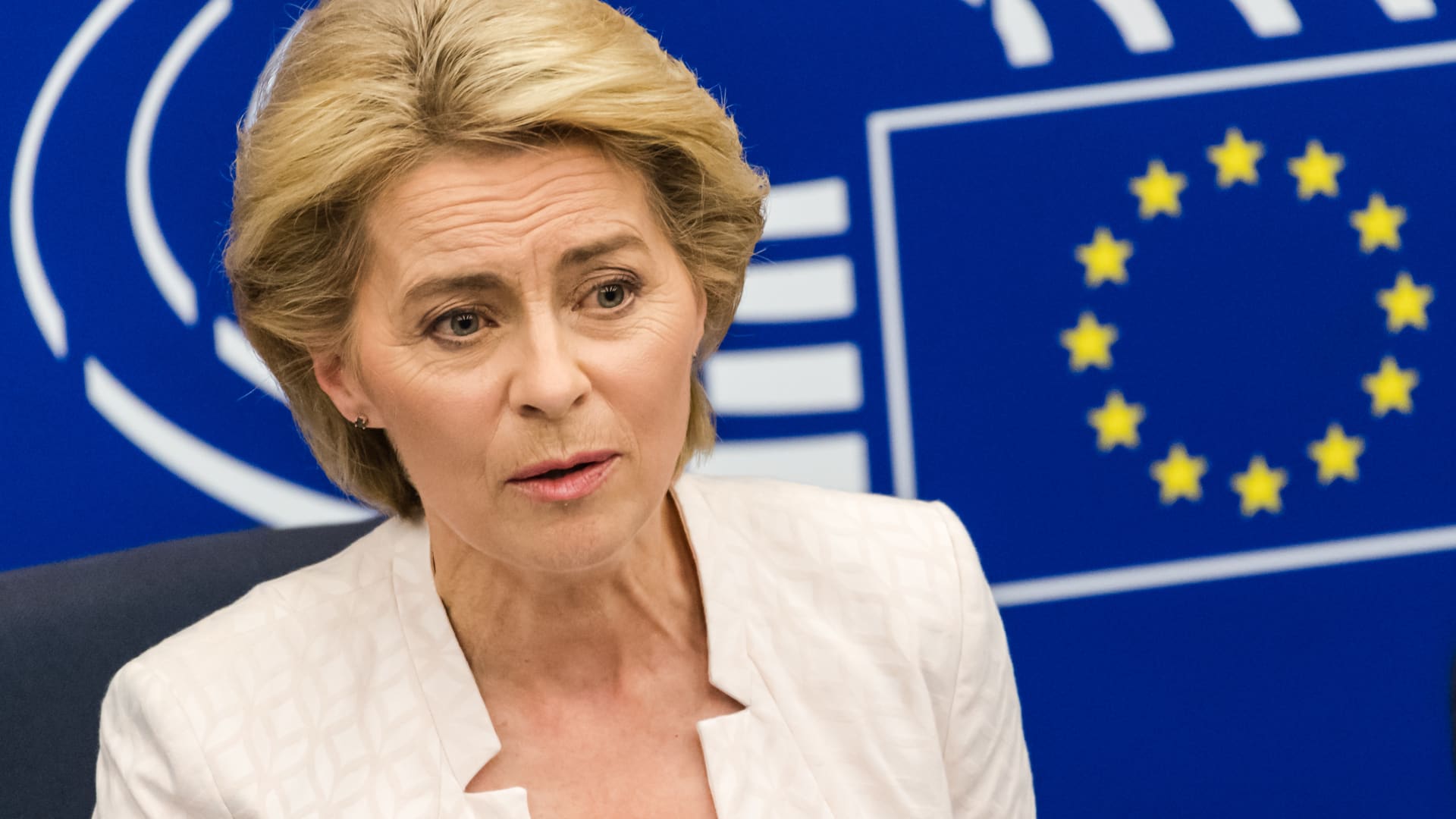 Ursula von der Leyen, incoming president of the European Commission, left, speaks during news conference at the European Parliament, in Strasbourg, France, on Tuesday, July 16, 2019.