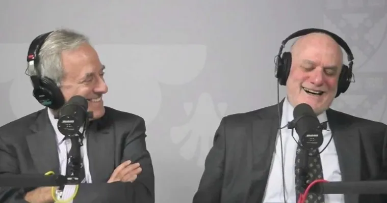 Co-hosts Royce Yudkoff, at left, and Richard Ruback share a laugh during a recording of Think Big, Buy Small, their popular Harvard Business School podcast about entrepreneurship through acquisition.